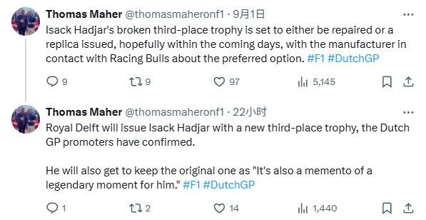 荷兰大奖赛的推广方确认哈贾尔将会收到一个新的季军奖杯,至于破碎的那个依然由哈贾尔保存,那是一个特别的纪念品~#F1##2025F1意大利大奖赛# 发布于:北京...