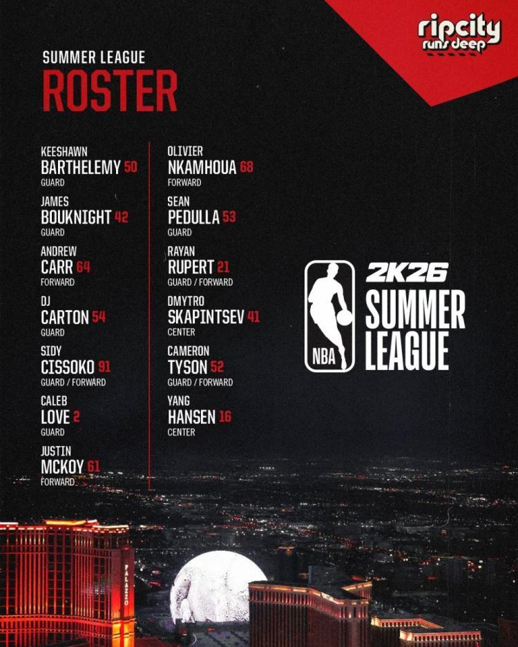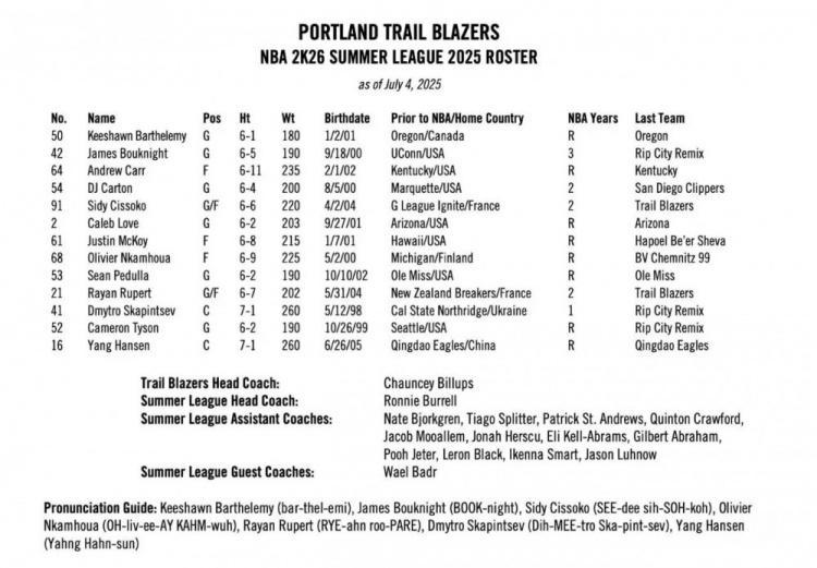 直播吧7月5日讯 开拓者官方公布了夏季联赛大名单,中国球员杨瀚森领衔。